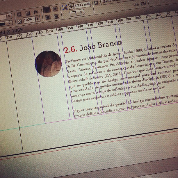 Professor at the Universidade de Aveiro since 1998, founded and coordinated Comunicarte, a magazine of the Department of Communication and Art and, together with professors Vasco Branco, Francisco Providência and Carlos Aguiar, formed the team responsible for the conception, framing and development of the Design degree at the Universidade de Aveiro (UA, 2011). Taking under consideration that João Branco (2001) believes that the problems of design business seem to refer to the need for sustainable management of this discipline, his presence in this thinking team and his dedication to design research for small and medium-sized enterprises reveals itself of nuclear importance.